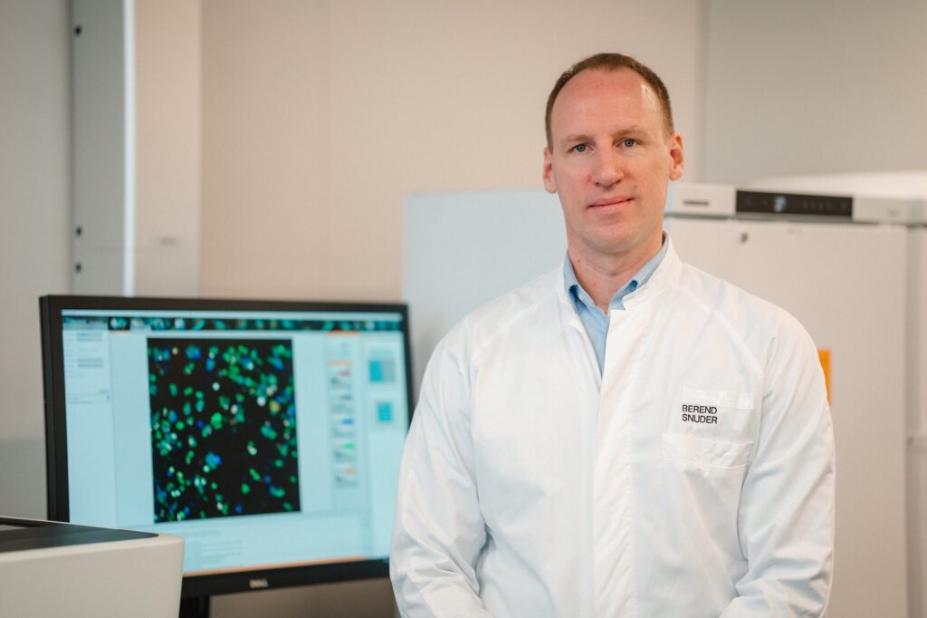 Over the past few years, systems biologist Berend Snijder has developed a screening platform that rapidly measures the cancer cells’ response to a large library of drugs. This might help select effective treatments tailored to the individual patient, thereby improving their prognosis. The technology works as follows: First, blood and bone marrow samples are taken from the patients and added to dishes with 384 wells. Each well contains a different drug that has been approved for AML. “We are currently testing 17 different drugs or combinations of drugs”, says Snijder. The dishes are then placed in an incubator and the cells interact with the drugs overnight. The next day, the cells are fixed and stained in order to distinguish healthy cells from cancer cells.